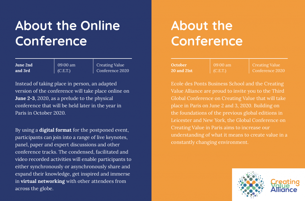 The online conference will allow us to practice, experiment and learn from the challenges and opportunities that come with social distancing. New and existing formats and technologies will be used, allowing us to link up as a dynamic community. We will be working together and sharing ideas, knowledge and good practices on value creation – and their impact on business and society. Insights and other results from the online conference will be worked into the ‘real life’ conference in Paris on October 20 and 21.