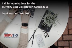 Dear Service Community, We would like to request nominations for the SERVSIG’s Best Service Article Award 2017 The “SERVSIG Best Services Article Award” is presented annually by SERVSIG to the...